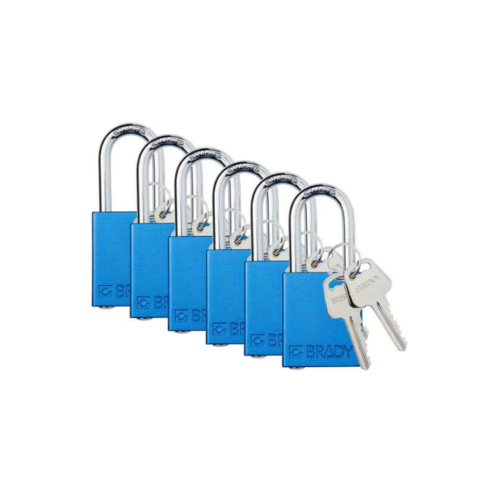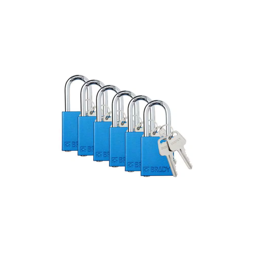 6 unid Candado con llave maestra, de aluminio, azul, altura del grillete de 1 1/2", ancho del cuerpo de 1 1/2" 12 llaves Brady
