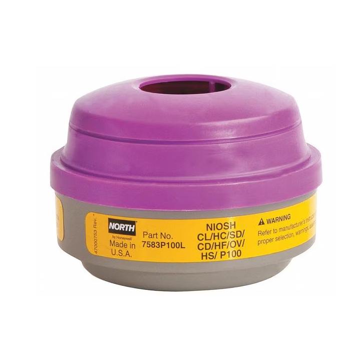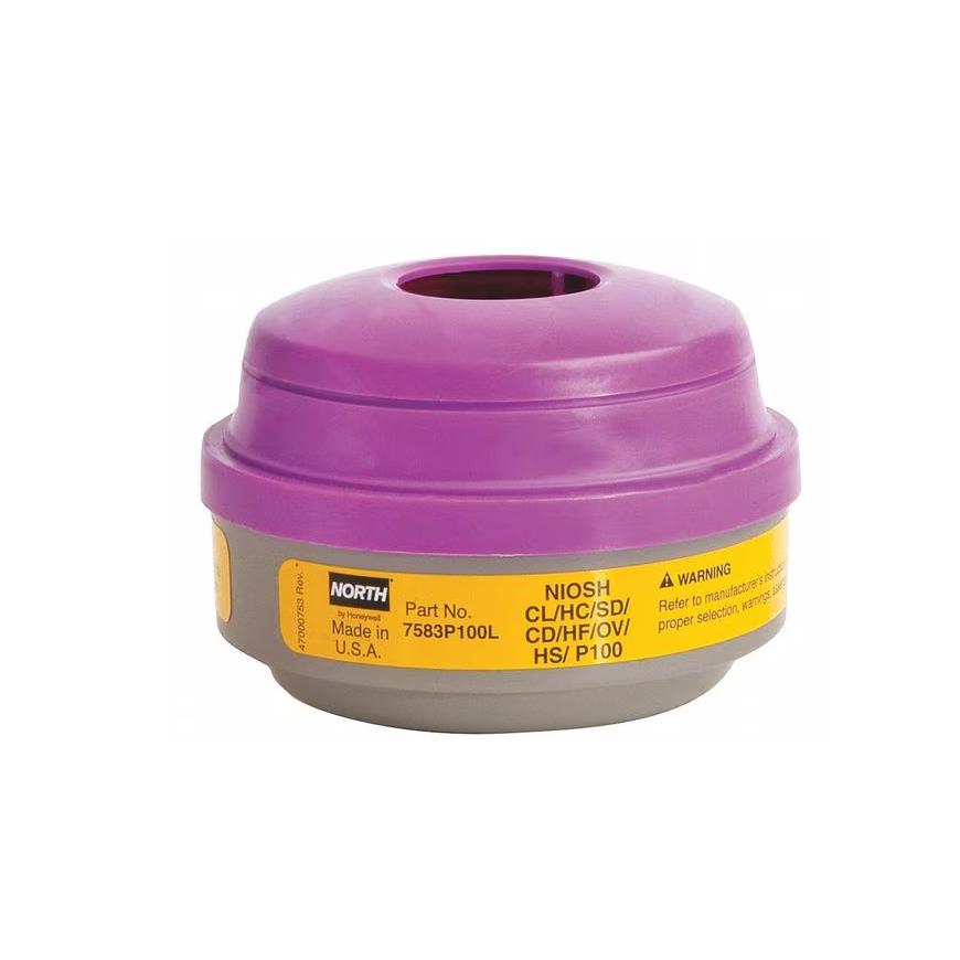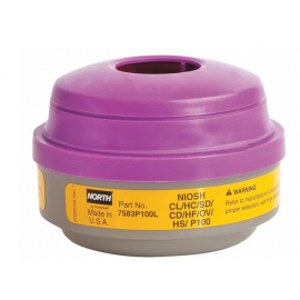 Aplicación típica cartucho combinado para vapores orgánicos y gases ácidos con filtro P100. Para entornos con vapores orgánicos y gases ácidos (cloro, cloruro de hidrógeno, dióxido de azufre, fluoruro de hidrógeno, dióxido de cloro).