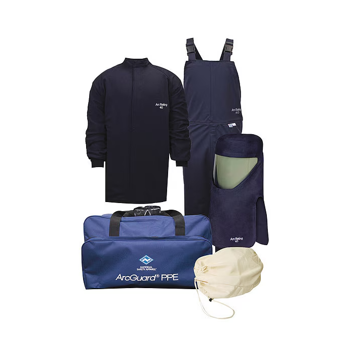 Chaqueta corta y peto de 40 Cal Compliance, capucha de protección contra arco eléctrico con protector facial PureView™, casco, bolsa para la capucha y bolsa para el equipo, gafas de seguridad.