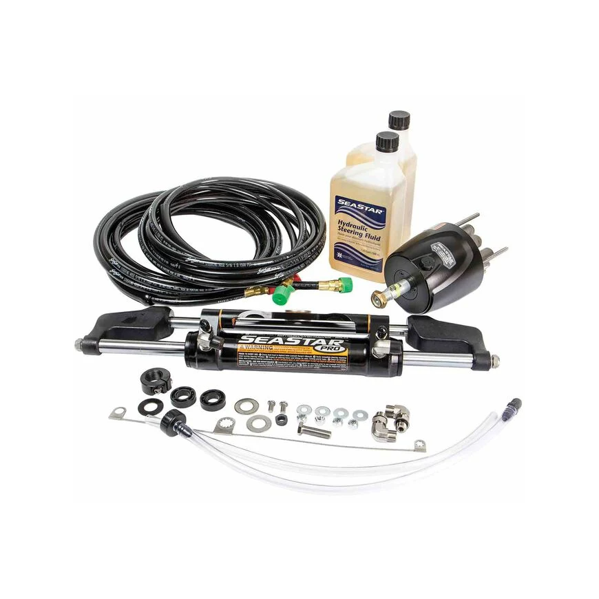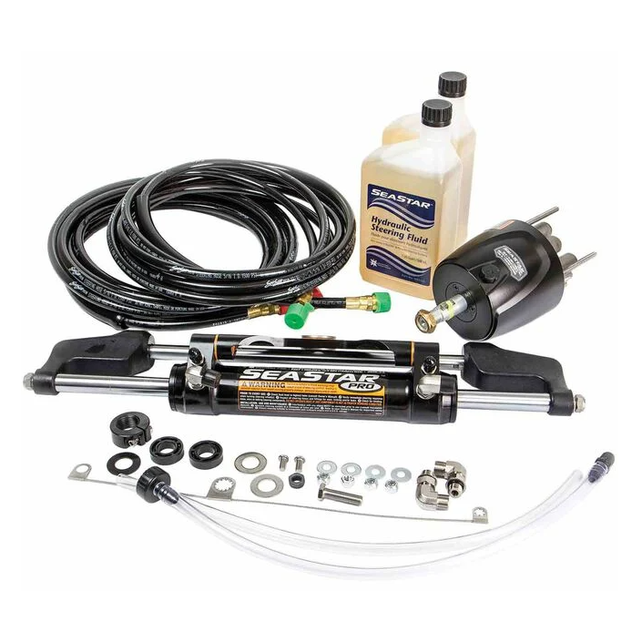 Timón, cilindro, accesorios, aceite, kit de purga y un par de mangueras prensadas de fábrica reforzadas con Kevlar®.