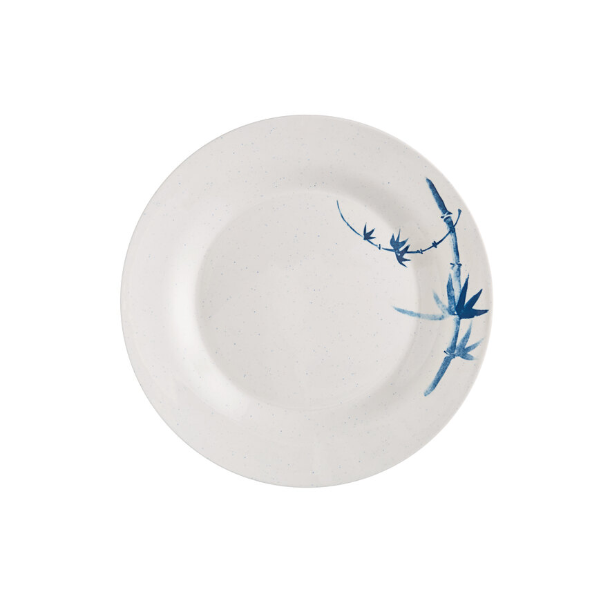 El cuerpo moteado en blanco y azul con un detalle de planta de bambú ofrece una presentación atractiva